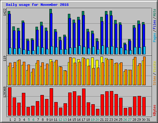 | Day | Hits | Files | Pages | Visits | Sites | KBytes | ||||||